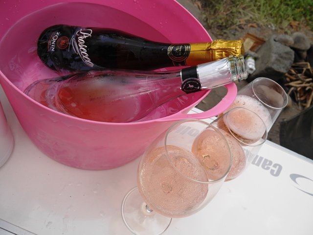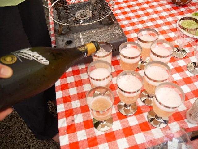 お友達夫婦が帰ってきたので泡で乾杯!!昼間アウトドアで頂く泡の美味しいこと。