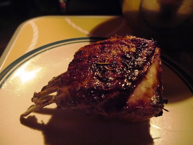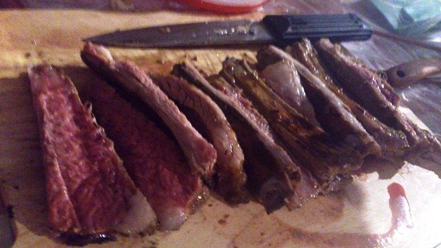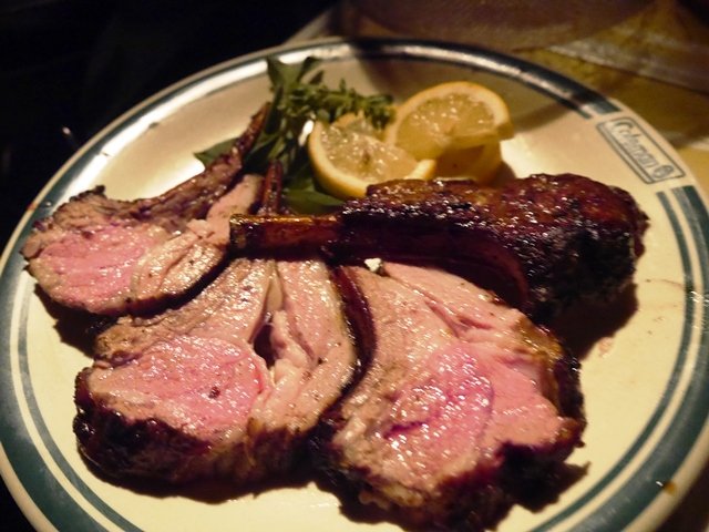 炭火で焼きあがったラムラック。美しい。