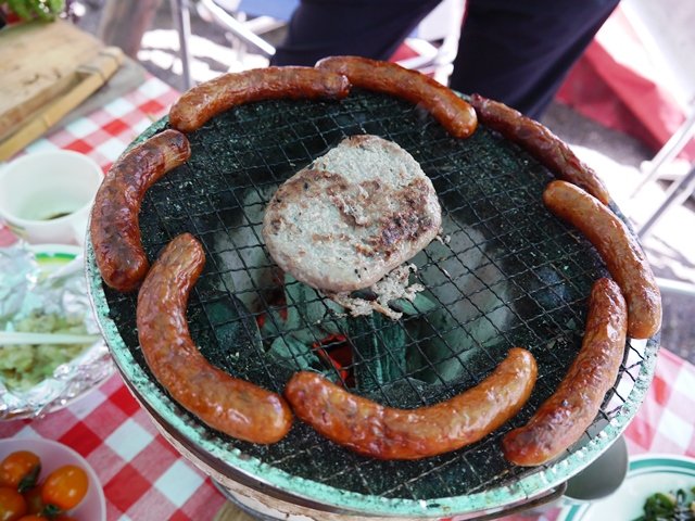 ちなみにソーセージはこんな感じで七輪の上。真ん中においてあるのは、ナカムラポートリーさんの鴨バーグです。