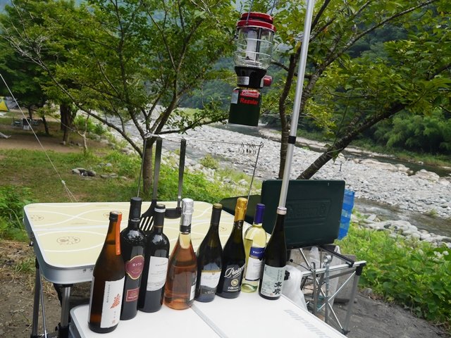 タープを設営し(ペグは諦め石を使いました)キッチンの設営。まずは持ってきたお酒を並べます。