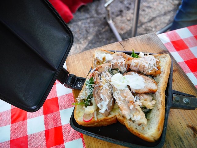 蕎麦粉のガレットの他、ソーセージや鴨バーグと野菜をぐいぐいっと挟んだホットサンドも作りました。
