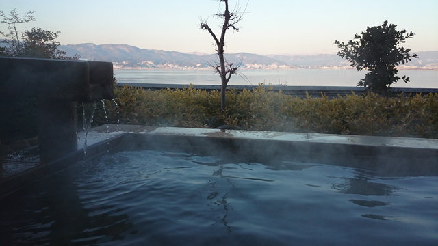 その後満願の湯へ。こちらのお湯は柔らかくて、露天風呂からは川と滝まで見えて、とても気持ちいい。