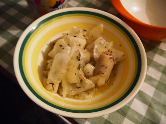 これは、大根とセロリとホタテ缶の和え物にしようと思ったらホタテ缶買ってなかった!スペインの小さなイカの缶詰と大根、セロリをお友達がさっぱりと味付てくれました。