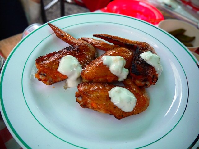 バッファローチキンウィングのつもり。本場ではブルーチーズドレッシングとセロリですが、似た感じに仕上がりました。