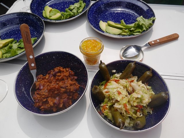 私が持ってきたチリビーンズとコールスローも箸休めに。ハラペーニョのピクルスがとても好評で何より。