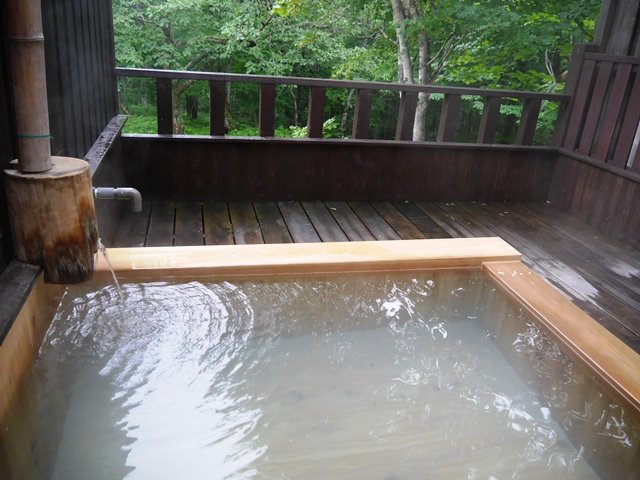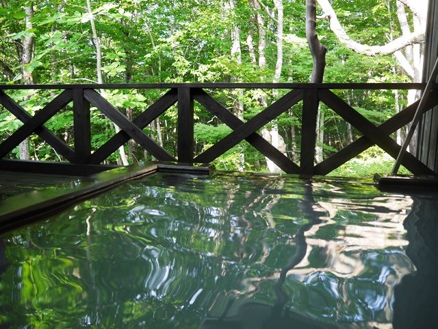 宿に到着したら、もちろんまずは露天でしょう!貸切風呂へとGO。翠を見ながらうっすらシジミ汁のようなお湯に身を浸すと、はあ〜っと思わず声が出ます。心地良い〜〜〜。
