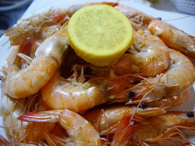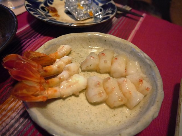 天使海老のビール茹で。皮ごとビールで茹でて、ガーリックオリーブオイル&バターで和えます。