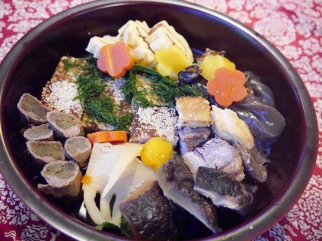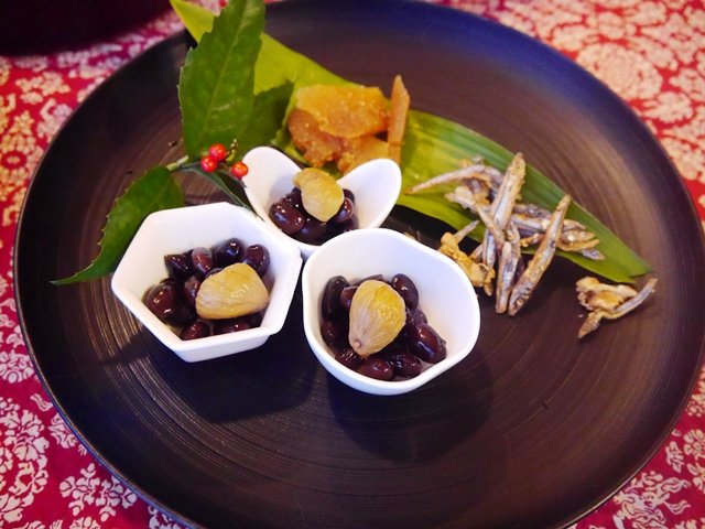 その他に、ごぼう牛肉巻、松風、ぶり照り焼き、伊達巻、椎茸と手綱蒟蒻の煮もの、たけのこと人参の煮物。