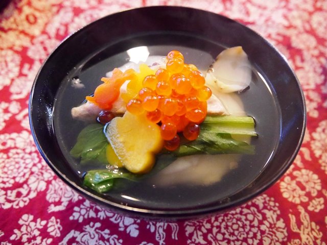かつお菜がみつからず残念ながら小松菜で。私にとっての雑煮はぶり雑煮です。もちろん丸餅!ちょっと豪華にいくらを乗せてみました。