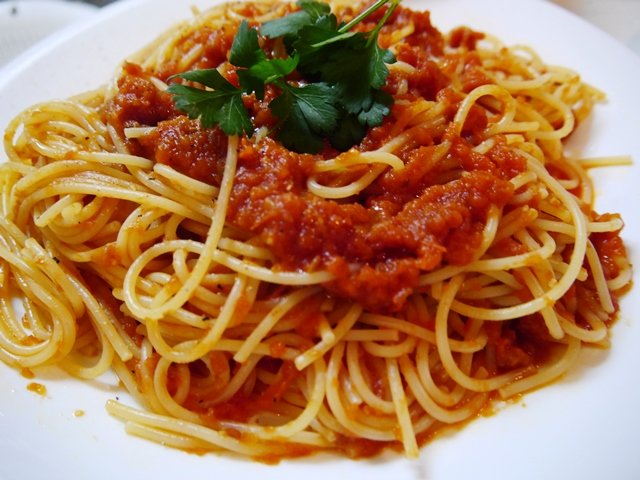 メニューにはトリプルトマトソースのパスタと書きましたが、普通のトマト、ミニトマト、ドライトマト、缶トマトが入っているのでクアトロトマトソースかな。トマトの旨み凝縮!