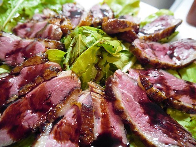 鴨のロースト、レッドカレーソース。レッドカレーソースは別に入れて、鴨にはいちじくバルサミコソースをかけました。このままでもいいし、大人はレッドカレーソースを付けてもまた別の味わいに。