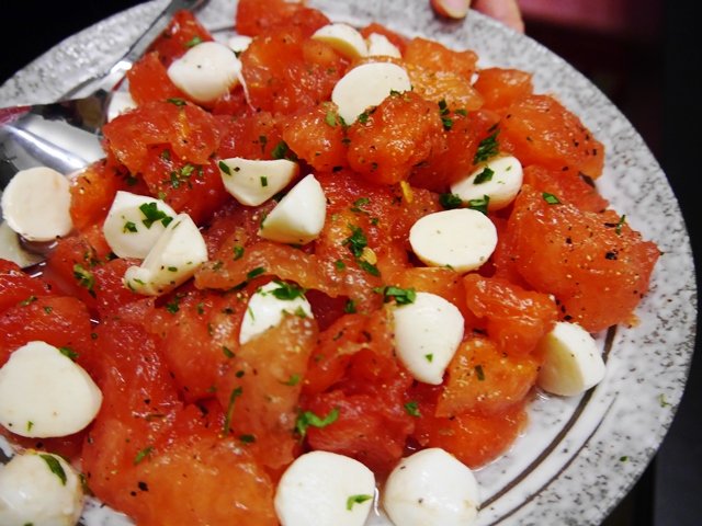 リクエストのあった、西瓜とチーズのサラダ。ビネガー、塩、胡椒、オリーブオイルで和えただけなのに、なんでしょう、この美味しさは。桃よりも調味料になじむ、一体化するような気がします。