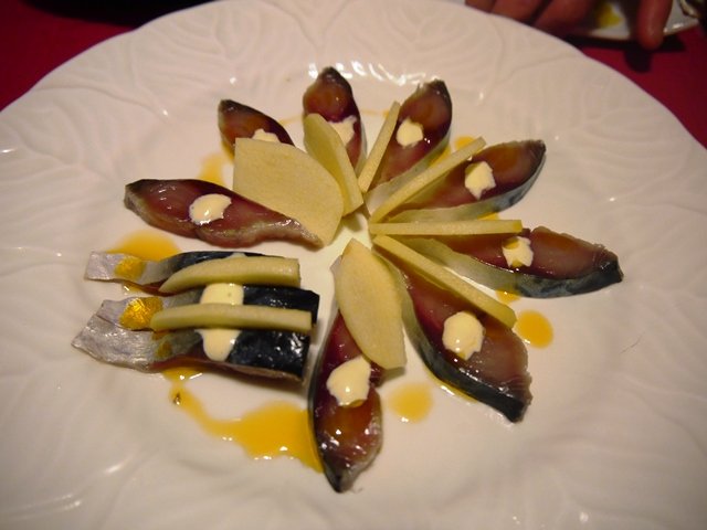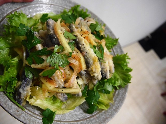稚鮎のエスカベッシュ。漬けだれは西瓜ジュース、ワインビネガー、にんにく、塩・胡椒。西瓜の皮も入れました。鮎と西瓜は合う、と思うのです。香りかな。