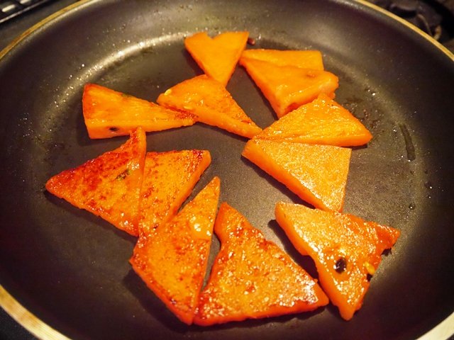 西瓜をソテー中。自分自身の糖分でカラメライズしたみたいにこんがりとなります。