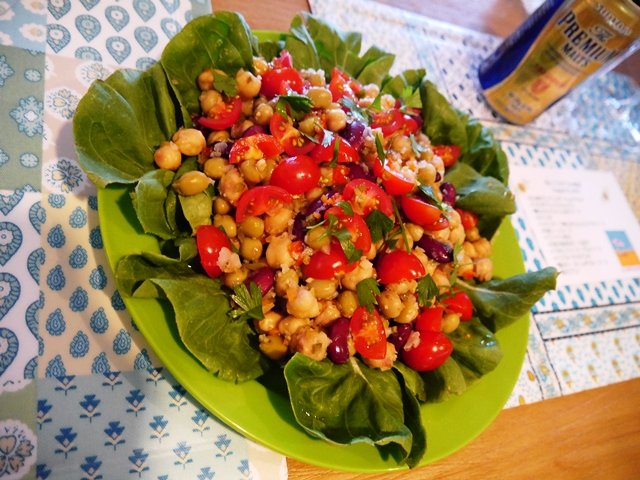 まずは豆豆サラダ。夏によくつくる一品です。現地でミニトマトを入れてさらに色鮮やかに。