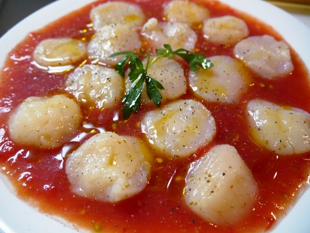 帆立はさっとスモークして、フレッシュトマトソースと美味しいオリーブオイルで。