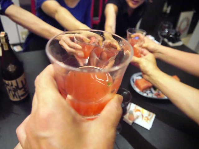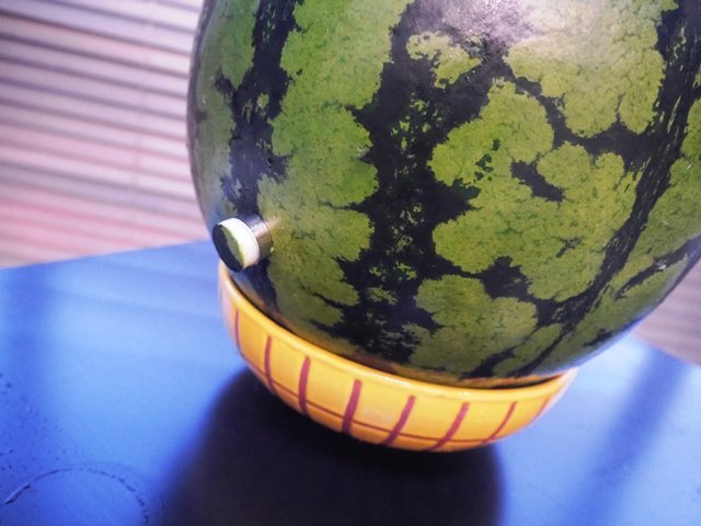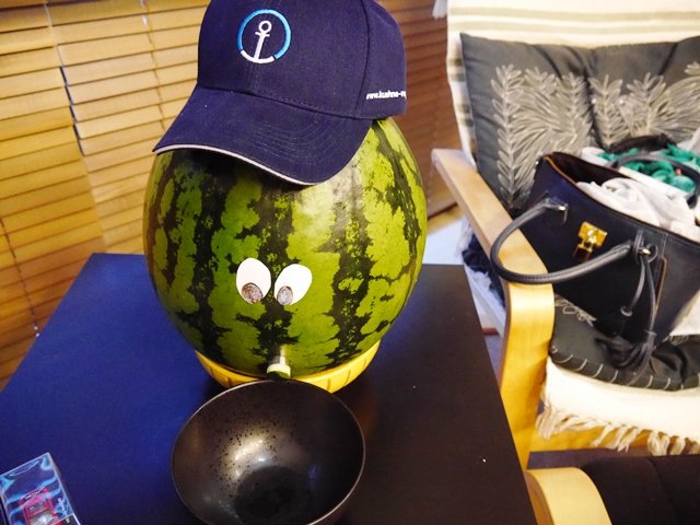 憧れの西瓜ジュースサーバー。口の所に何をつけようかと候補のものを用意していたのですがうまくいかず、現地で穴をあけた時に、あ、このままでいけるかも、ということに。ちょっとでべその西瓜ちゃんになりました。西瓜のストッパーを外すとジャーっと西瓜が出ます。ちょっと原始的だけど一応できた!大きな西瓜で、中身を出してジュースにするのに苦労しました。ゲストの方に手伝っていただいてなんとか4.5Lもの西瓜ジュースが出来ました。