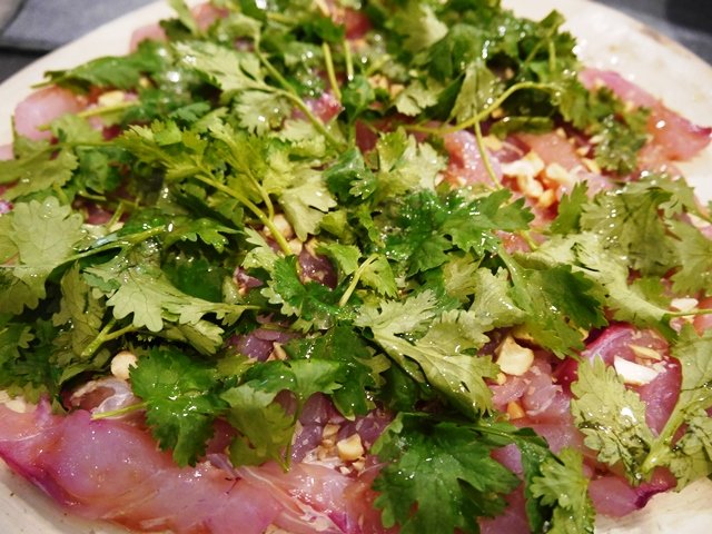 秋田の天然鯛のお刺身を中華風に。パクチーたっぷり、アツアツの胡麻油をじゅわっとかけます。