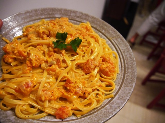 西瓜のクリームパスタ。西瓜をにんにくと炒めて、生クリームと合わせて、スモークパプリカ、ナツメグを少々、塩・胡椒で味付け。色は雲丹パスタみたいですね。シャキシャキとした西瓜の食感が残っていて楽しい。