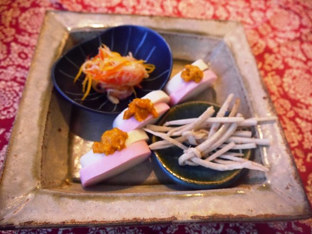 紅白なます、結び牛蒡、かまぼこに礼文島の雲丹を乗せたもの。