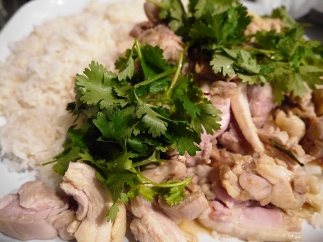 チキンライス。ご飯はもちろん鶏を茹でた汁で炊いたタイ米です。
