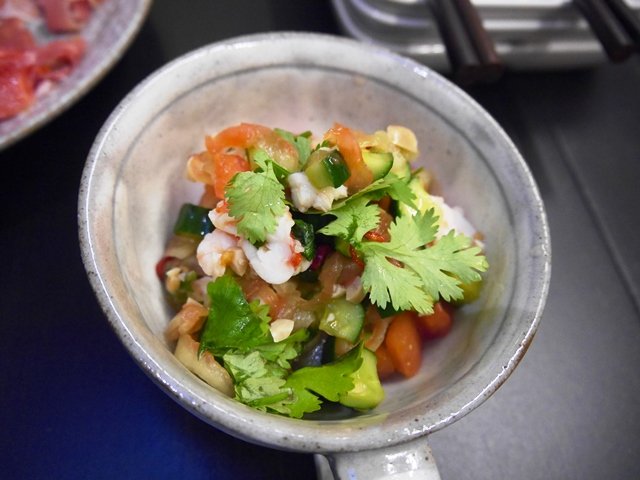 最初の一品は鯛のセビーチェに西瓜のゼリーを乗せたもの。これは前回も作りました。