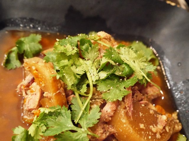 肉骨茶(バクテー)をサーブした後の大根。漢方スパイスがよーく染み込んでいます。