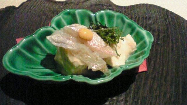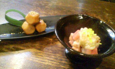 おいものたいたん。前に来たときに食べたものは白醤油で甘めの味付けに生の山椒がぴりりっと効いて新鮮な味でした。ここのはどちらかといえば関東風?な味付けでしたが、味は濃すぎず、いい感じでした。生麩は出汁で煮た後にちょっと甘めの葱味噌に菊の花が入ったものが乗っていて、日本酒にもあいそうと思ったけど、我慢我慢。