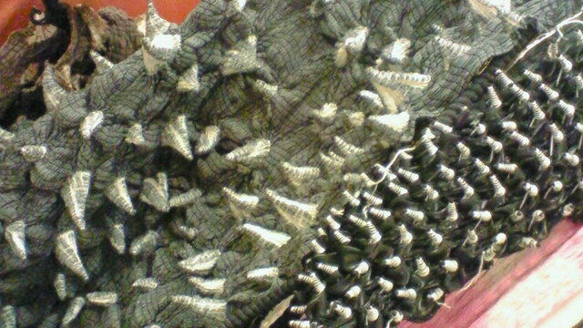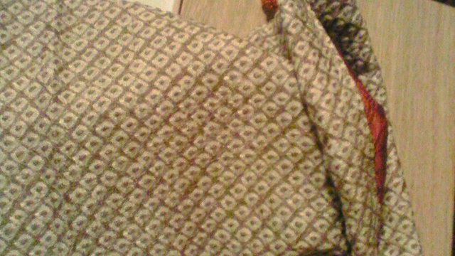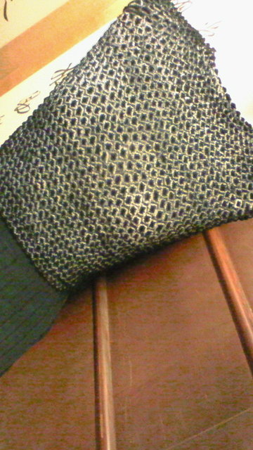 こちらはまた違う形の絞り。黒字に白糸で円錐形に絞ってある形はまるでパンクロックの衣装のスパイクのよう。解いたものもまだまだスパイクがはっきり残っていて、このまま洋服にしてもアヴァンギャルドな感じで面白いかも。ところで絞りといえば全体に模様の入ったものばかりをイメージしていましたが、必ずしもそうではないみたいです。前から素敵だな〜と思っていたたにかなさんのコート。若干グレーがかったコートにいくつか小さな白い模様が散らしてあって、桜の季節には花びらかしら…と思っていましたが冬見ると雪のひとひらにも見えてとっても素敵。そのコートも、京絞り寺田さんの作品だそうです。全て手作業で一点ものなのだから、お客様の要望を入れた品を作るのも特別なことではないと聞いて、なるほどな〜と思いました。私もイメージにあって長く着れる着物用コートを作っていただきたいなぁ〜。