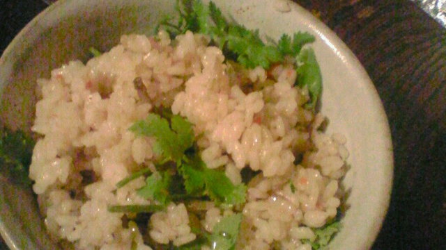 鴨ごぼうご飯の残りは、香草のざく切りを混ぜて電子レンジで温めて。
