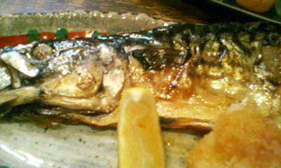 塩さばの炭火焼はジューシー!鯖を保存するために塩漬けした、鮭の塩漬けと同じものだと思うけど、塩が強すぎず、脂が程よく乗っていて皮はこんがりと。いい塩梅です。