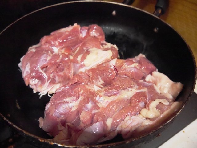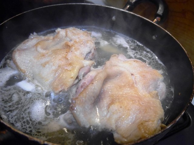 鶏は皮目から焼いて、お湯をかけて焼き蒸しに。