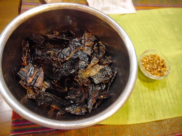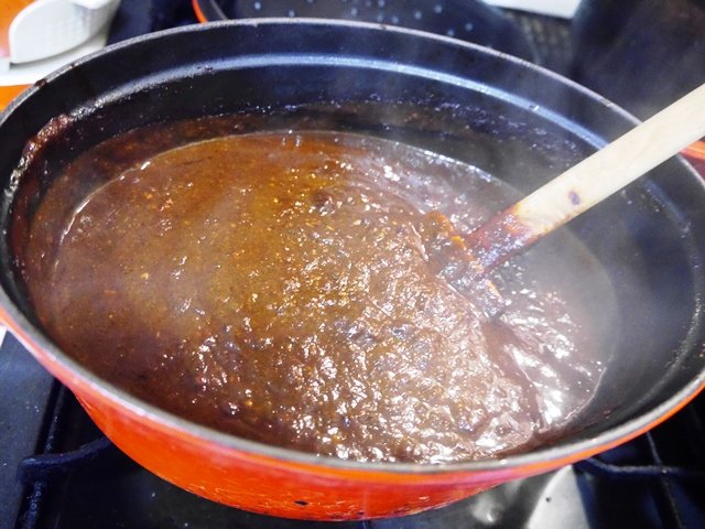 そして、写真撮り忘れてしまったのですが、レーズン、アーモンド、パンプキンシード、唐辛子の種少々をそれぞれオイルでさっと煮て取り出したものと、刻んでオイルで炒めたにんにく、クローブ、胡椒、コリアンダーシード、シナモン、ごまをトマティーヨピュレに混ぜます。この工程がちょっと面倒。