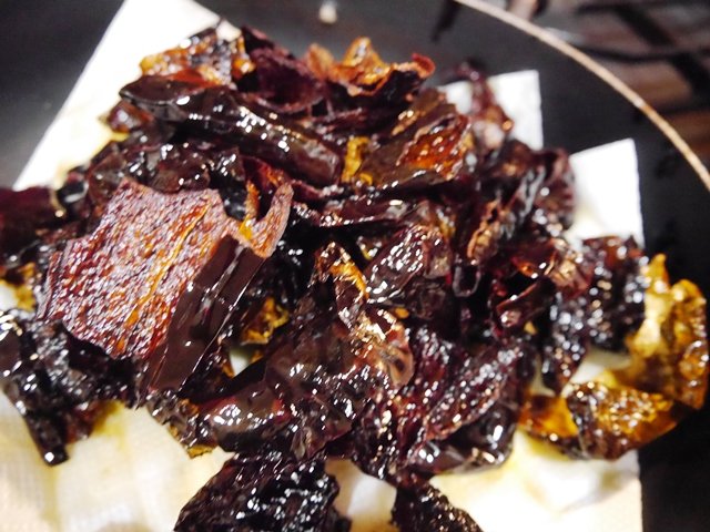 唐辛子はさっと油で揚げます、焦げないように、ほんの数十秒ずつ、少しずつ。