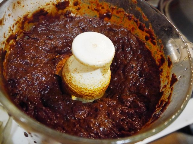唐辛子が浸っているお湯も混ぜながらフードプロセッサでピュレ状に。この時点ですでにチョコレートっぽい。
