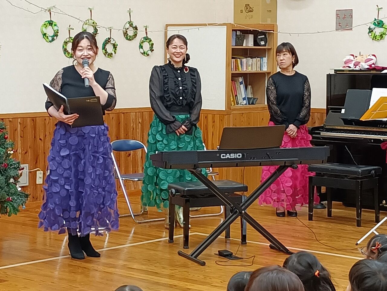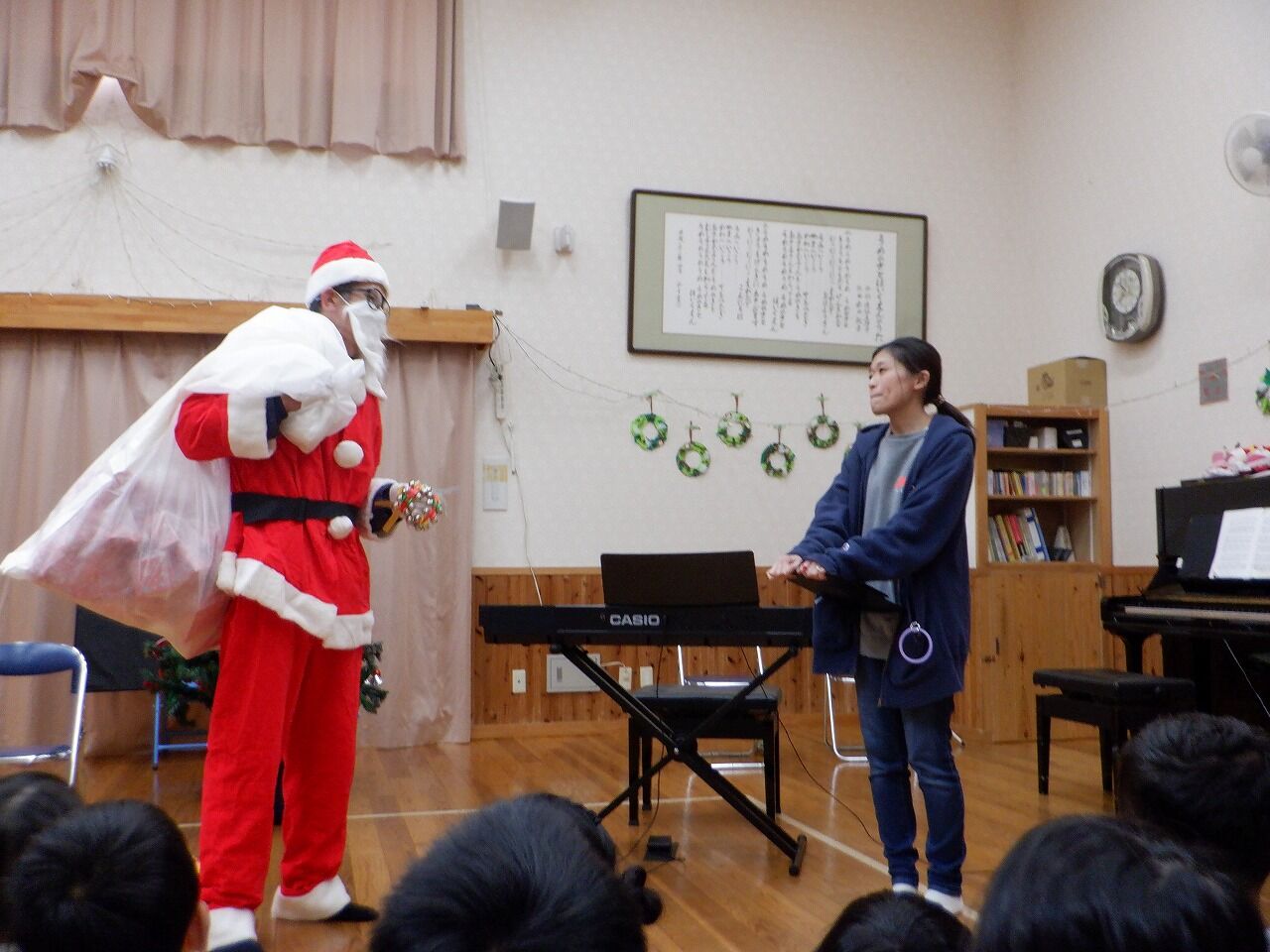 コンサートが ♪虹 で終わり、3人の先生方が退場されると、玄関に現れたのは、サンタさん!