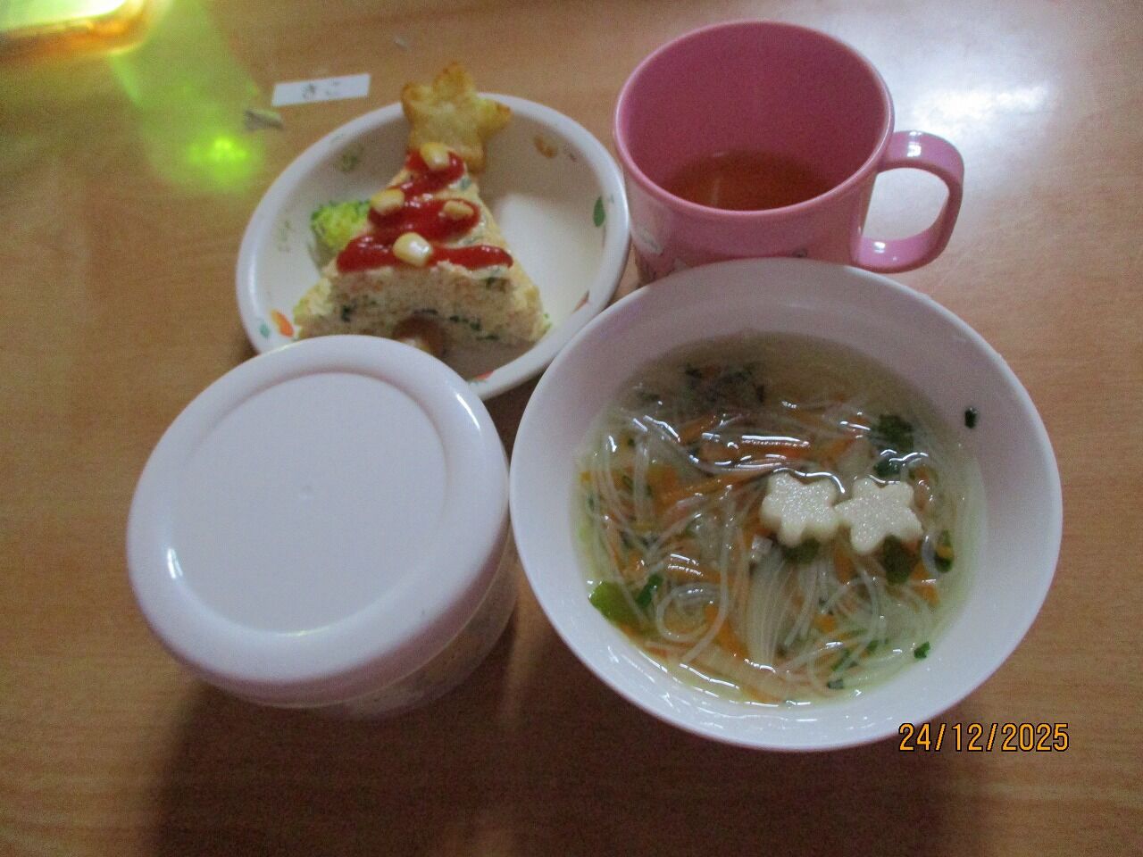 今日の献立は、『クリスマスツリーハンバーグ、星形ポテト』です。
