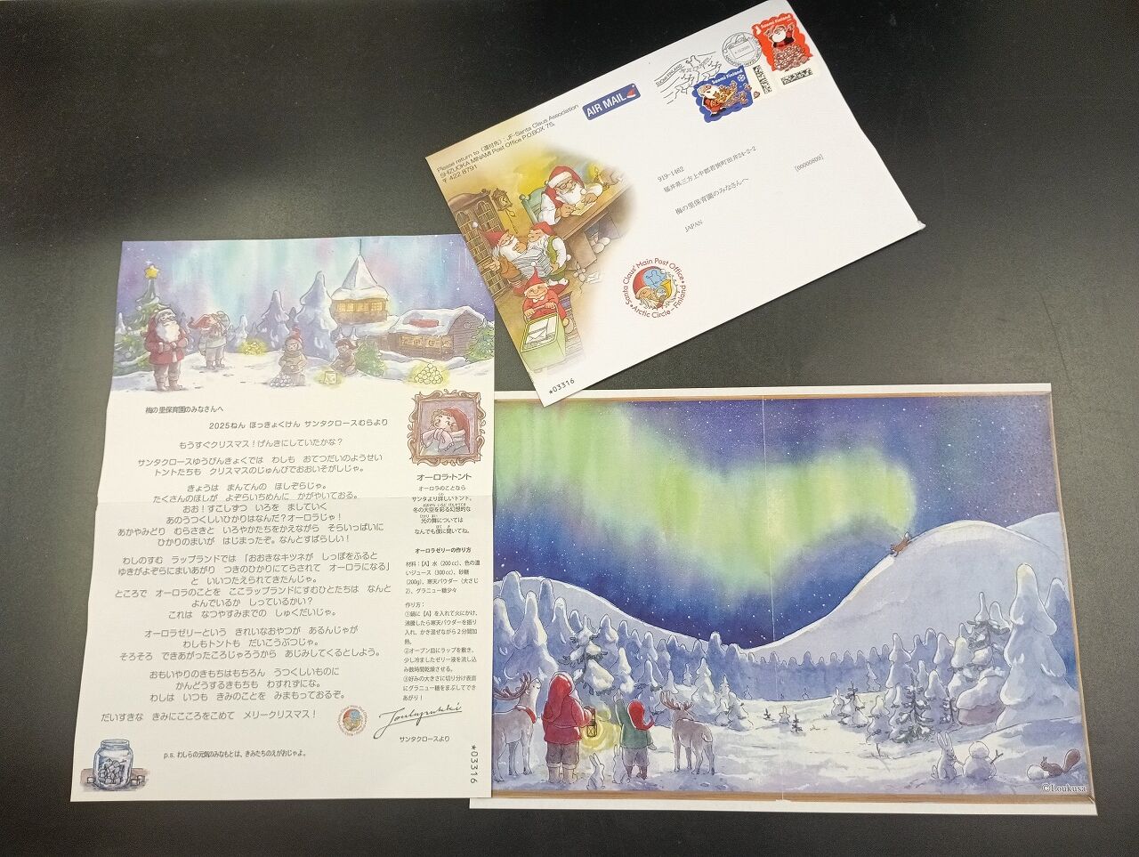 一昨日、ポストに入っていた封筒。なんとサンタさんからのお手紙です。昨日、朝のお歌の後、大きい子達の前で読みました。ちょっと大きくしてホールに掲示しておくと、文字が読めるようになってきているかぶとさんが、一生懸命読んでいました。