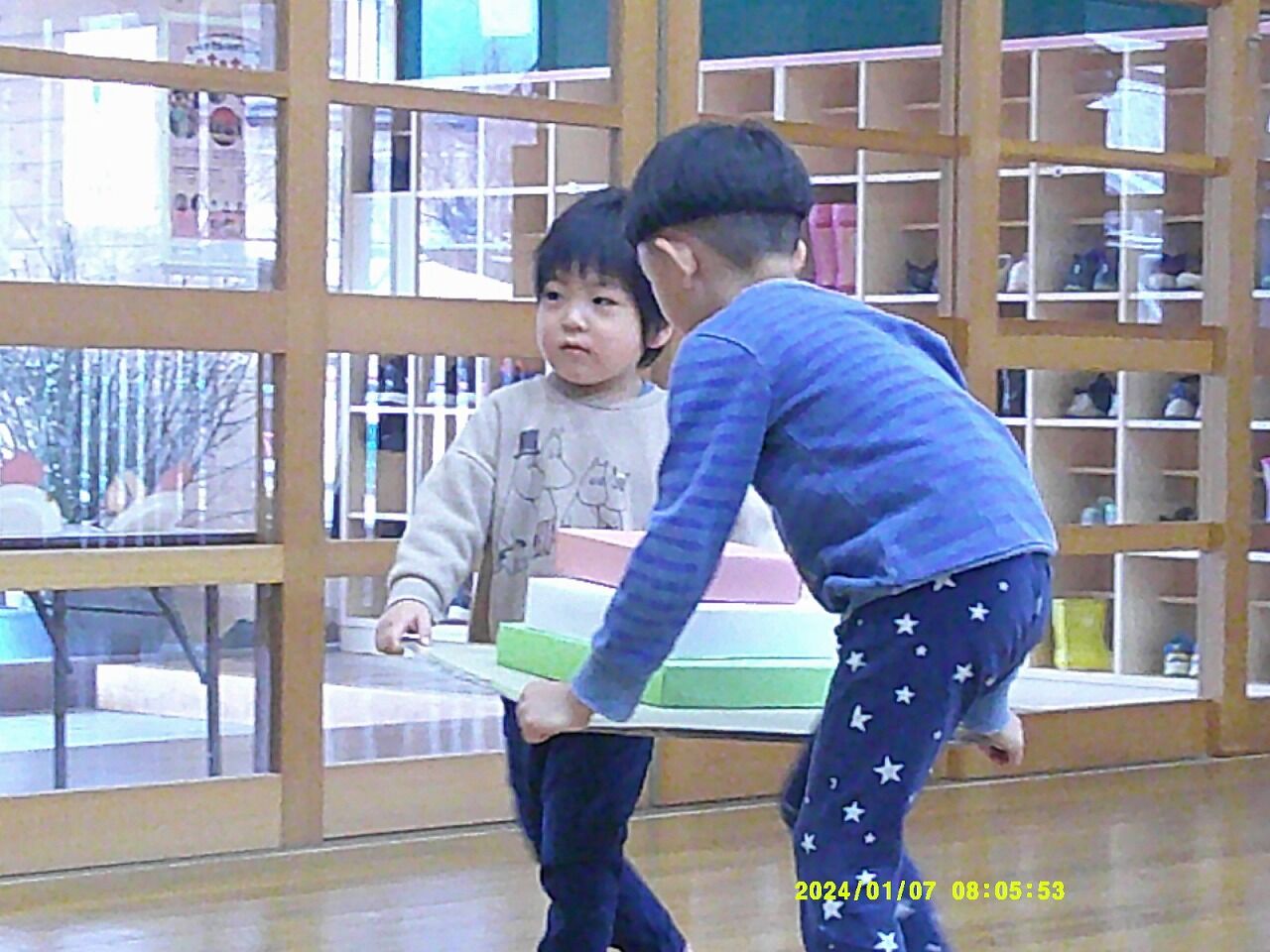 最後は『力をあわせて落さないようにひし餅を運ぶゲーム(仮題)』をしました。