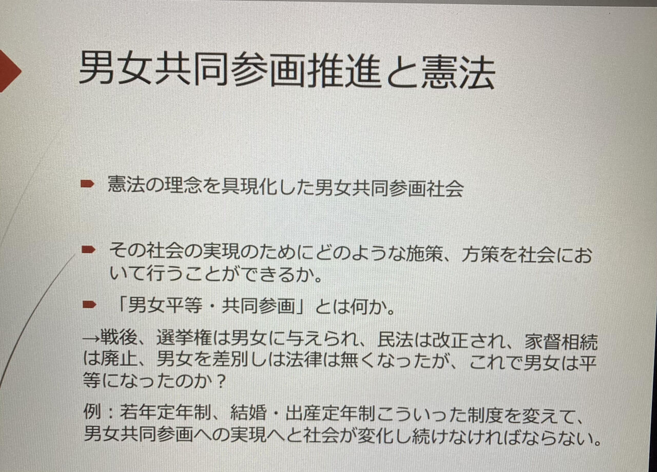 事前に提示されたレジュメは1頁程度の簡潔な資料だったので、詳しい内容は講演時にお聞きすることにしました。自己紹介から始まり、男女共同参画推進と憲法、クオータ制、その歴史、