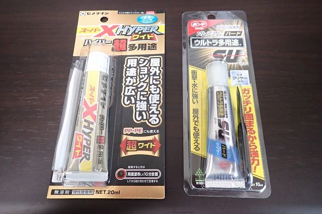 今度はステップアップリングと接着しますが、工具箱の中にはスーツボンドしか入ってなかったのでホームセンターでセメダインXを買ってきました(488円)。しかし隣の棚には見たことのないセメダインSUなる新商品があるではないですか!せっかくなのでこっちを買うことにします(423円)。でもセメダインXは普段遣いに使えるのでこっちもGETしておきます。