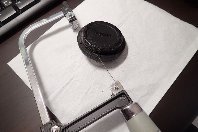 因みにステップアップリングはオリンパスでも売ってますが同じようなもんが3,219円もします。で、工作開始。と言ってもタダで付いてきたのキャップのマウント部分を切り取ってステップアップリングに接着すればいいだけなので大したことはしません。まずはキャップを切断。これには工具箱の中にあった糸鋸を使いました。