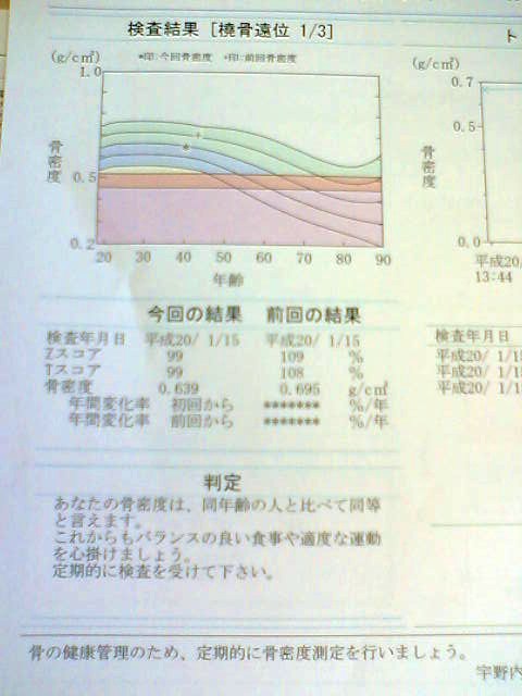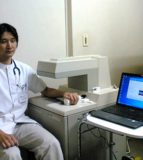 写真のように右利きであれば左の腕の前腕(くるぶしから肘)を機械に乗せます。あとは自動的にスキャンするだけ、検査時間は約2分程度です。ちなみに写真は自分であります→検査を行ったところ正常でした。