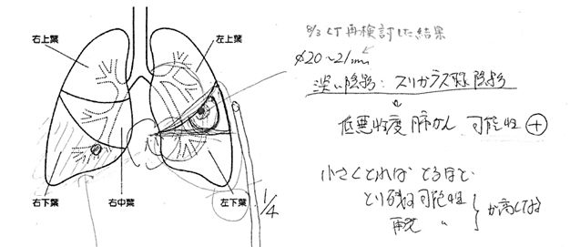 肺は2つではなく、左肺(2つの部屋)、右肺(3つの部屋)からなっていますが、この女性の場合は左肺の左下葉に、φ20~21mmの癌がCTで観測されていました。このままだと左肺の1/20を切除しなければならないという状況でした。