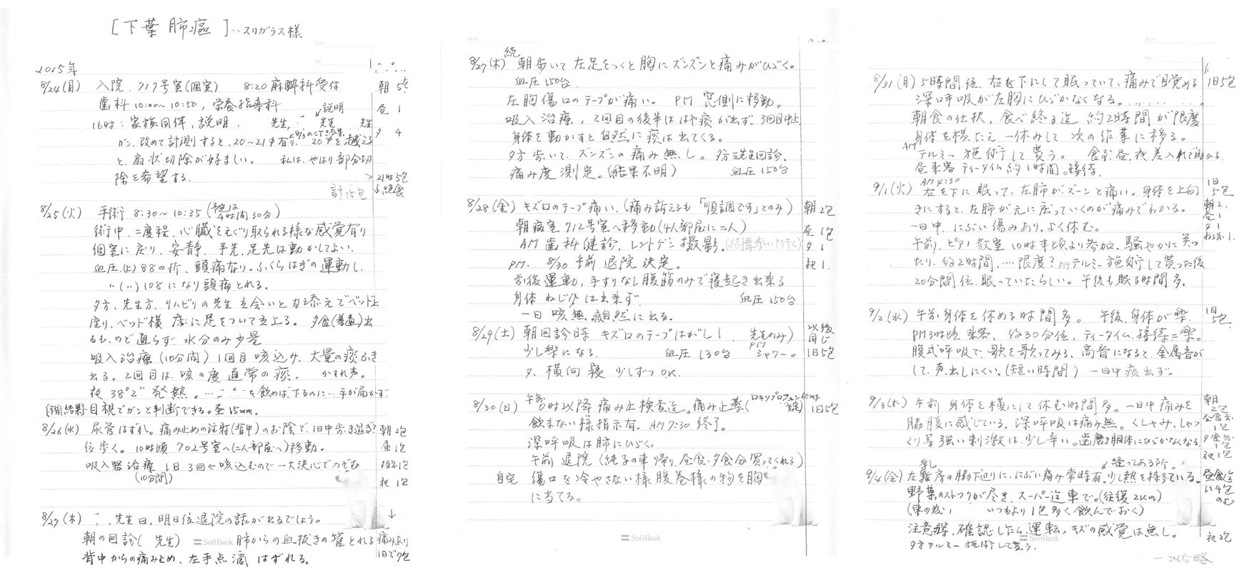 手術の前日(8/24)、家族同伴の説明があり、CTの画像を検討した結果20~21φmmスリガラス様のものがある。20φmmを超える場合、扇型に切除する様勧めている(左肺の1/20)それでも私は部分切除を希望し、娘も希望通りにして欲しい旨。手術中やむを得ないと先生が判断された場合は、それを受け入れる旨を伝えました。