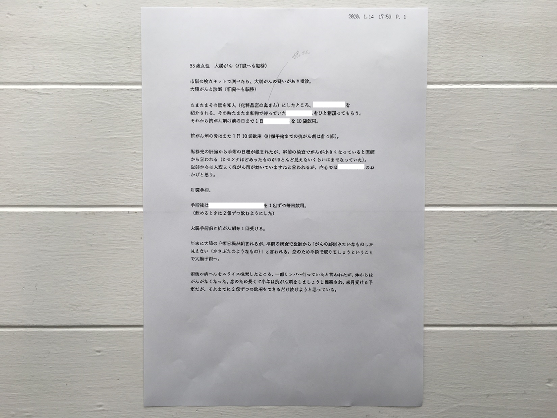 大腸がんになった女性が知人から紹介されたBRMGの商品を飲んで良い結果が出たそうです。その知人の娘様が記事を書いてくださり、その原本をFAXしていただいたものが上記の写真です。