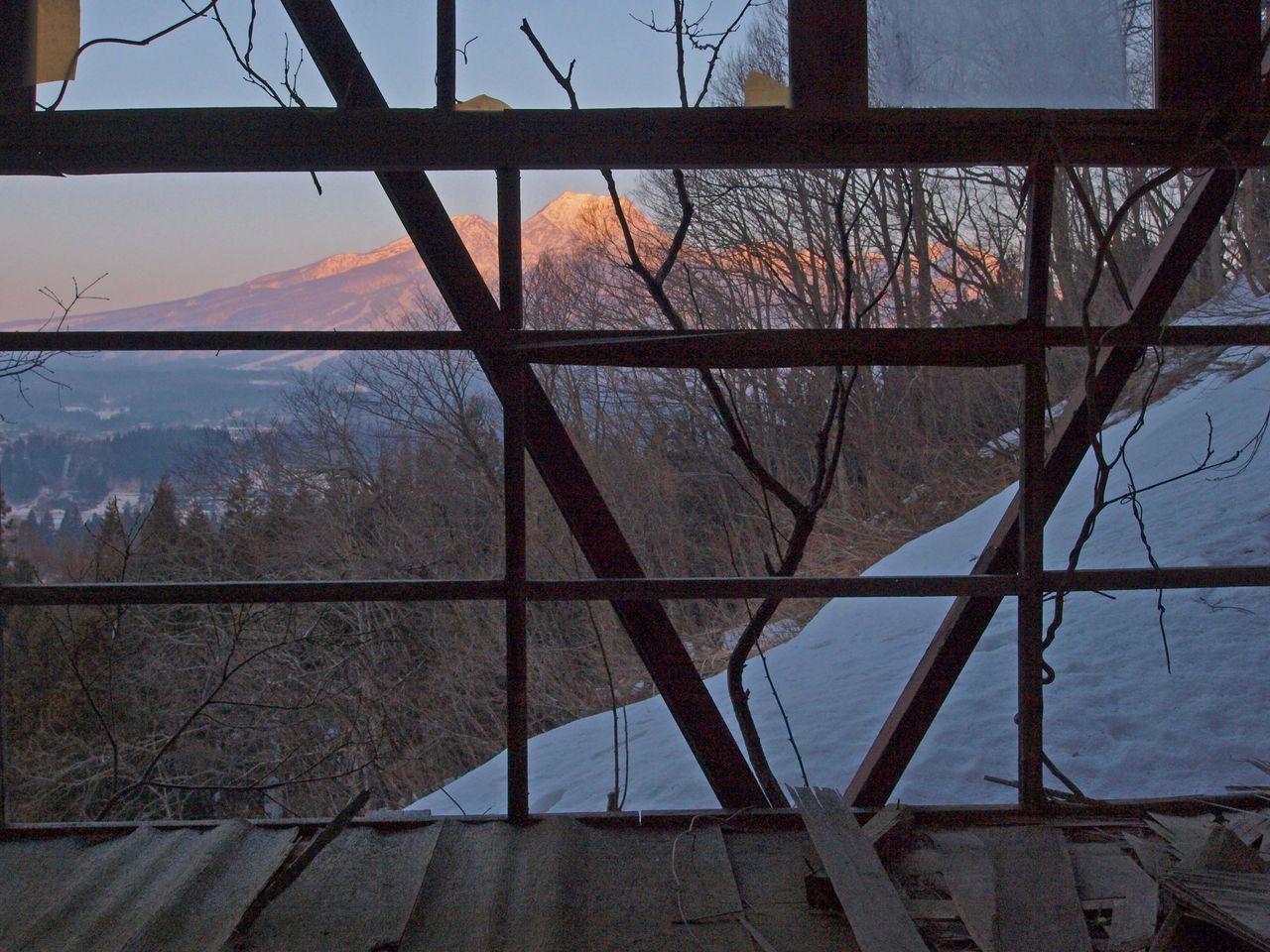 梯子を登って崩壊した2階部分の鉄骨を通して、朝焼けに燃える百名山「妙高山」が見えます。