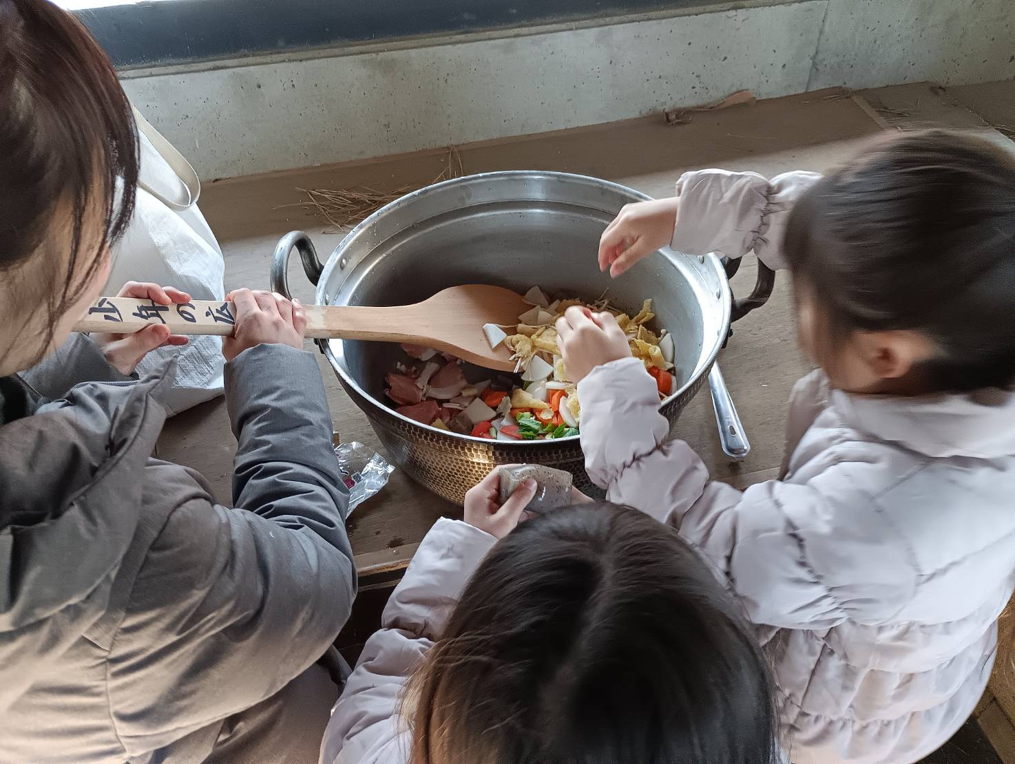 豚汁は12時頃の仕上がりを目指しています。材料は一家族手のひらにのるくらい、刻んでからお持ちください。12時近くにお越しの方は、お豆腐など、火の通りやすいものをお願いします。肉・味噌はこちらで準備します。