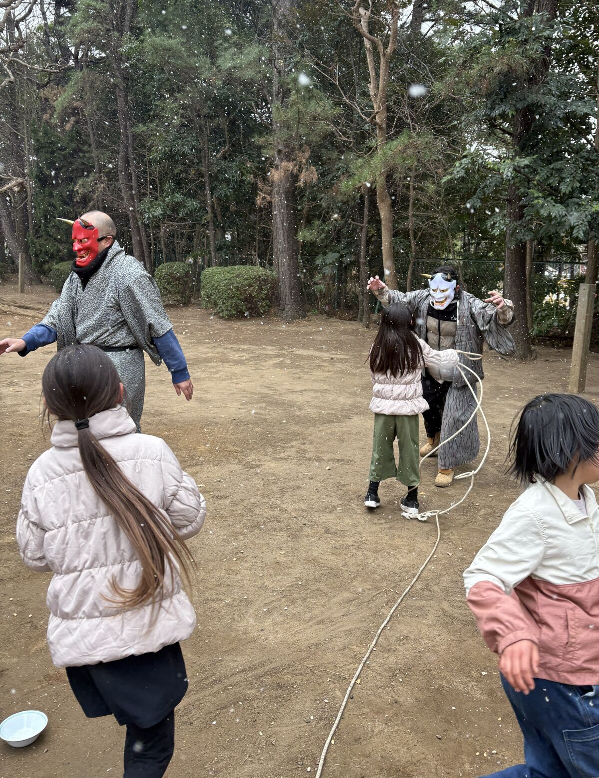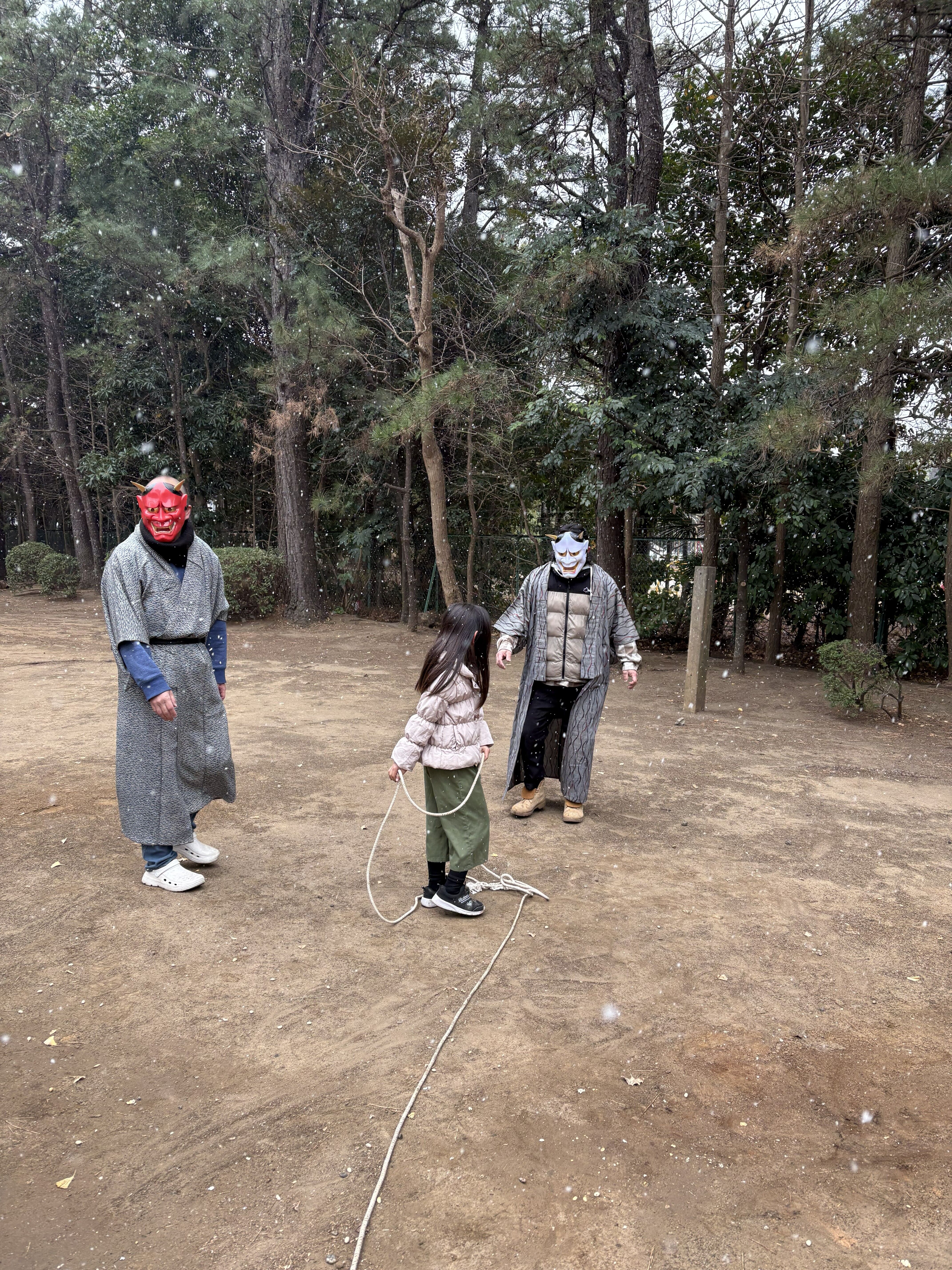雪がちらつく中に赤白の鬼。豆を投げる子供たち・・・