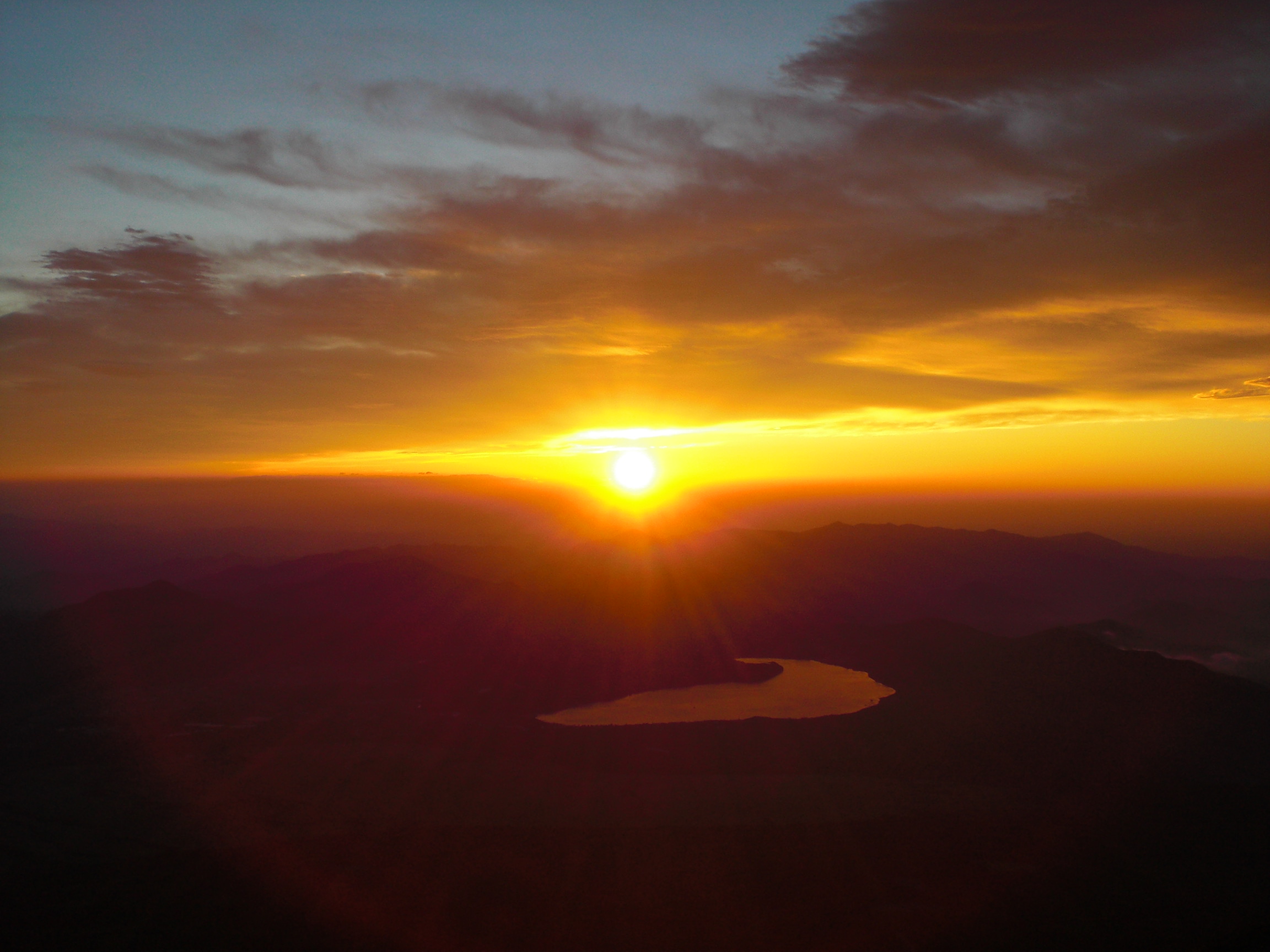 ご来光の頃には随分風も穏やかになり(と言ってもまだけっこう強風でしたが)、昨年に引き続き、美しい日の出を楽しむことができました。個人的には山頂から見たご来光より、8合目からのご来光の方が好きです。たぶん、眼下に広がる樹海や湖が山頂より近いからかなぁ… この辺は、ホント個人の好みだと思います。山頂ほど混んでいないのも良かった理由のひとつかも。